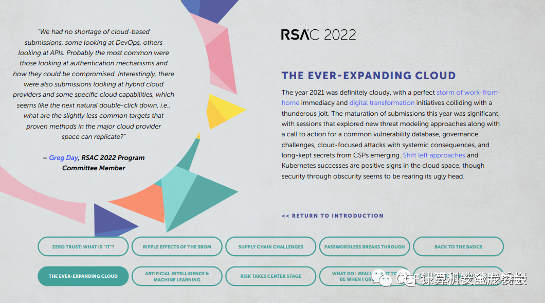 云服务时代的到来使得云安全有关的建议和方案激增,安全即服务、云安全威胁、云部署与防护、云应用程序安全等得到了研究和实践,特别是全球疫情环境下的远程管理与交付、远程办公和业务云迁移,这为云安全带来了巨大的机会和挑战。2022RSA会议上将探讨新的威胁建模方法,呼吁建立通用漏洞数据库、治理挑战、具有灾难性后果的以云为中心的攻击手段,以及云安全防护的长期手段是什么等议题。