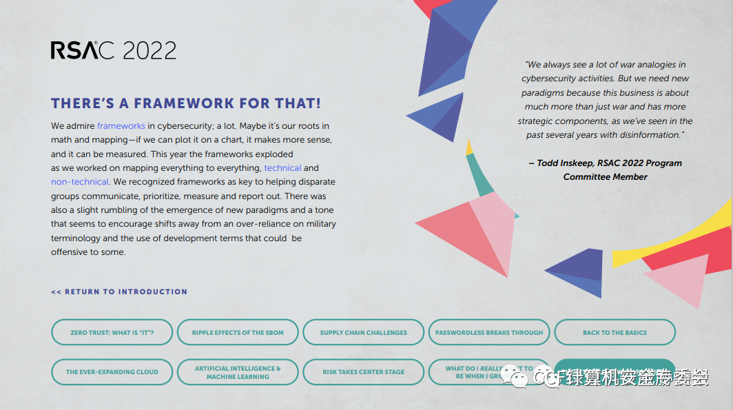我们赞赏网络安全框架,很多也许是我们在数学和地图上的根,如果我们能把它画在一张图表上,它会更有意义,并且可以测量。今年,我们致力于将所有内容映射到所有内容,无论是技术性的还是非技术性的。我们认为框架是帮助不同群体进行沟通、确定优先级、衡量和报告的关键。此外,还有一种新范式的呼声出现,鼓励人们从过度依赖军事术语向通俗易懂直接了当的方式转变。