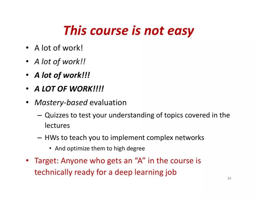 作为学生,你将学习构建深度学习模型所需的各种工具。作业通常有两个部分,即Autolab和Kaggle。Kaggle部分允许我们探索多种架构,并了解如何调优并持续改进模型。所有作业的任务都是相似的,学习如何使用多种深度学习方法解决相同的任务是很有趣的。总的来说,在本课程结束时,你将有足够的信心构建和调优深度学习模型。