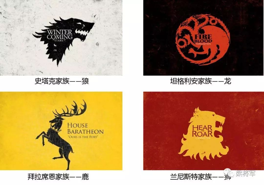 我们就拿你们热爱的《权利的游戏》举例,里面的几大家族的族徽就是一只动物: