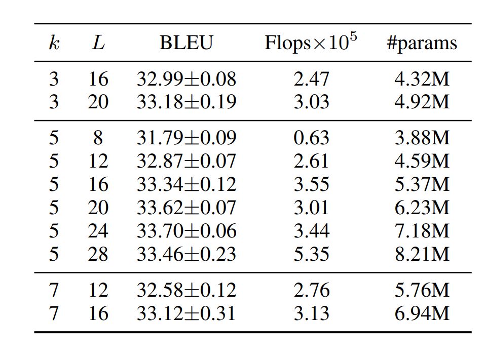 在不同的滤波器尺寸k和深度L下,我们的模型(g = 32,ds = dt = 128)的表现。