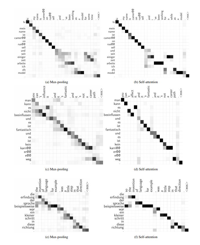 因此,添加明确的“自注意模块”具有非常有限、但十分积极的效果。然而,我们模型中的最大池化运算符生成的隐式句子对齐,在性质上与注意力机制生成的对齐类似。我们在IWSLT'14数据集上评估了我们的模型,将德-英双语互译。