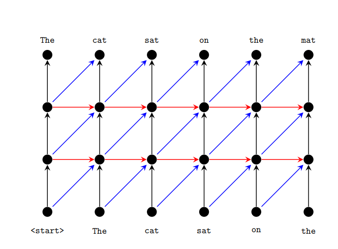 上图为具有两个隐藏层的解码器网络拓扑的图示,底部和顶部的节点分别表示输入和输出。水平方向连接用于RNN,对角线方向连接用于卷积网络。在两种情况下都会使用垂直方向的连接。参数跨时间步长(水平方向)共享,但不跨层(垂直方向)共享。