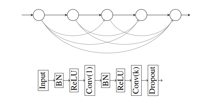 块级(顶部)和每个块(底部)内的DenseNet体系结构