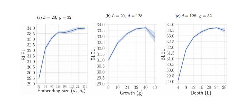 令牌嵌入大小、层数(L)和增长率(g)的影响