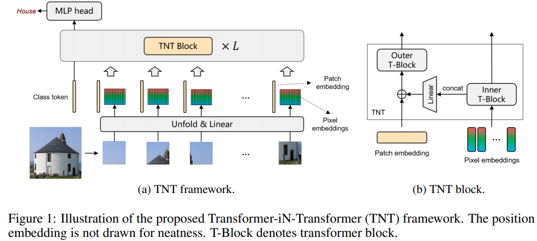 一种用于基于结构嵌套的 Transformer 结构,被称为 Transformer-iN-Transformer (TNT) 架构