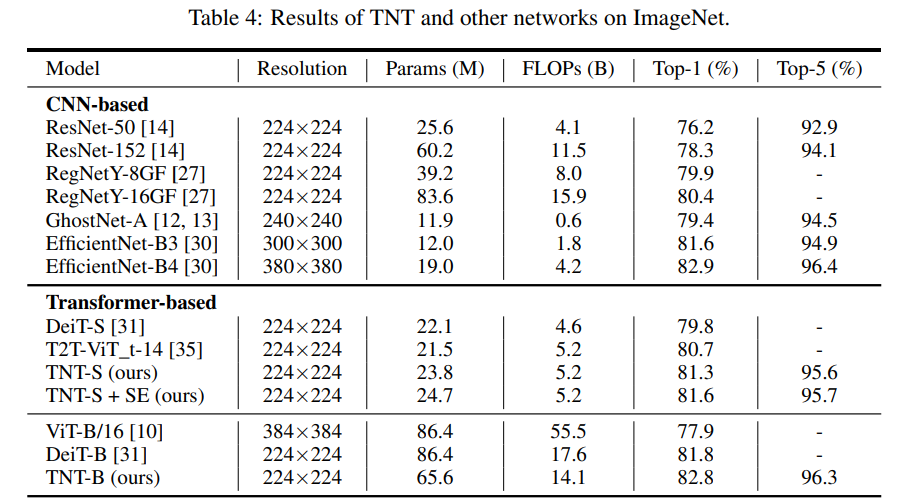 ImageNet 数据集上 TNT 与其他网络的对比结果。