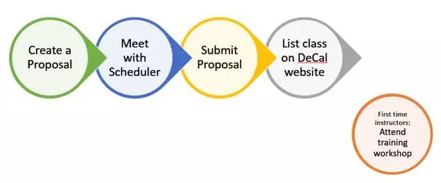 UCB还有一类课程,是让学生自己开课,被称为(DeCal),就是完全由学生自己组织、上课、布置任务的特殊课程(学生自己开课流程如图⑤)。