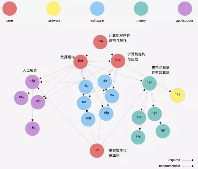 UCB CS专业课的课程体系将课程分为lower division和upper division两种,类似国内的专业必修课和专业选修课。此外,课程体系中每一门课都有一些先修课,整个形成一个知识树(见图③)。
