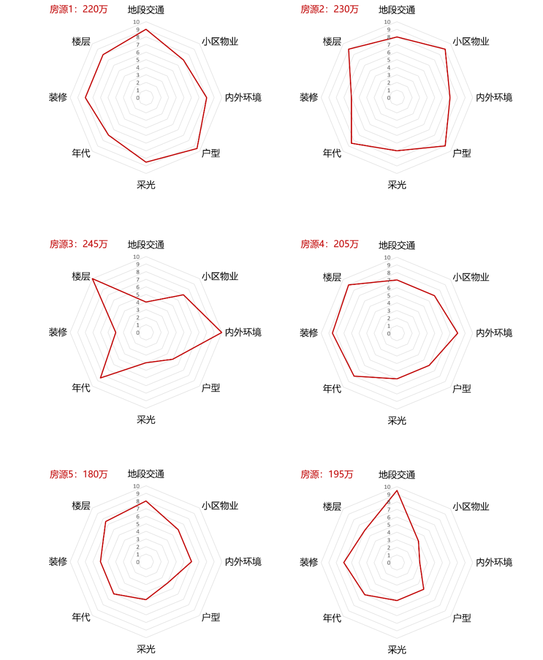 每套房子的评价参数有8个,分别是:地段交通、小区物业、内外环境、户型、采光、年代、装修、楼层。通过给不同指标打分,可以得出每套房子的雷达图(如图1)。