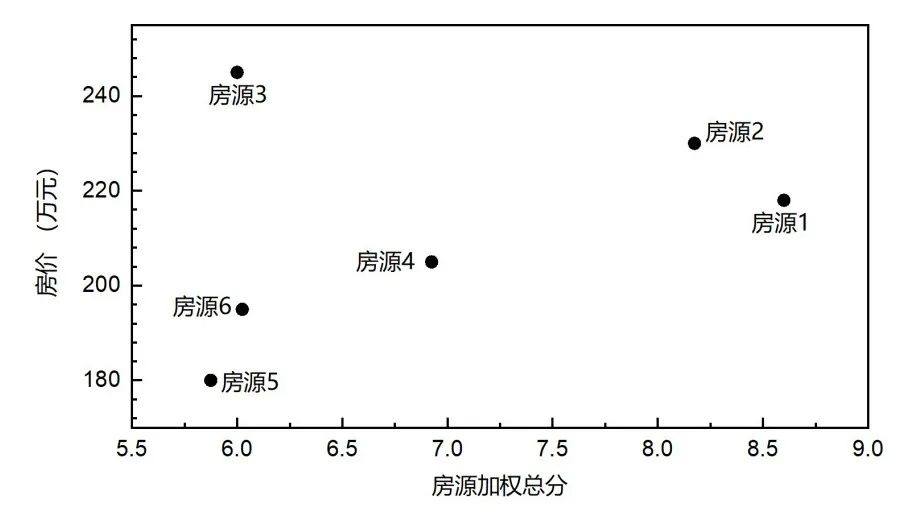 X君先后看了二十多套房子,为了便于媳妇决策,他建立了一个模型,最终筛选出了六套备选方案。