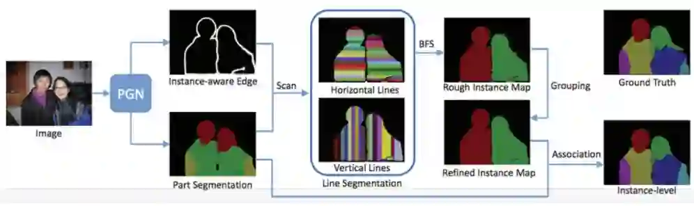 图 5:使用本文方法处理实例级人体解析任务的流程图。首先由 PGN 处理,同时扫描部分分割图和边缘图以创建水平和垂直分割线。就像连通图问题一样,广度优先搜索可用于将线段分组成区域。此外,实例边界附近的小区域被合并到它们的邻近区域,包括更大的面积和多个部分标签。结合实例图和部分分割图,该流程最终输出预测准确的实例级人体分析结果,无需来自目标检测的任何 proposal。