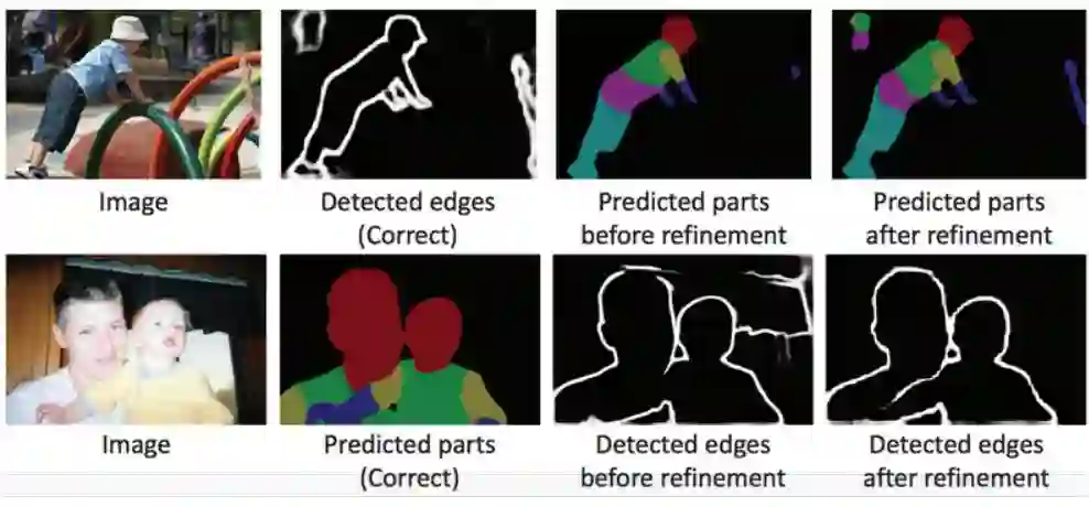 此外,与其他 proposal-free 方法 [25,15,22] 通过几个独立的网络将实例对象分割任务分解为多个子任务并采用复杂的后处理不同的是,PGN 借助统一网络无缝地集成了部分分割和边缘检测模块,它首先学习共享表征,然后添加两个并行分支,分别处理语义部分分割和实例感知边缘检测。由于两个模块通过共享一致的分组目标而保持了相互之间的高度相关性,PGN 得以进一步整合了一个细化分支,利用互补的语境信息使两个目标相互受益。通过无缝地补救每个目标的误差,这种集成的细化方案能够很好地处理那些具有挑战性的案例。如图 2 所示,我们可能无法通过分割分支定位小孩,但是可以通过边缘分支成功检测到他的位置,或者使用细化算法来校正实例边界被错误标注的背景边缘。给定语义部分分割和实例边缘检测,一个有效的切割推断(cutting inference)可以通过联合扫描分割与边缘图对线段进行广度优先搜索,并利用这个结果生成实例级的人体解析结果。