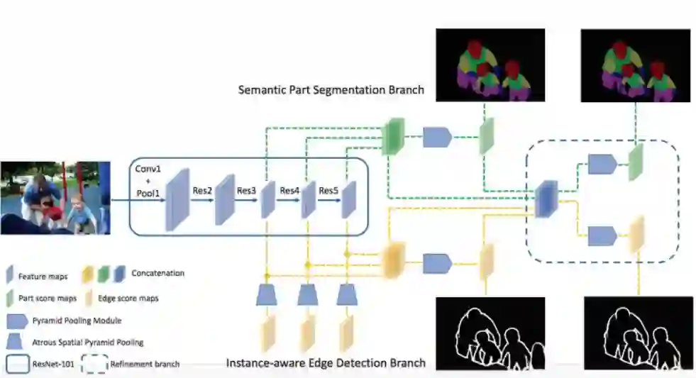 图 4:部分分组网络(PGN)图示。给定输入图像,使用 ResNet-101 提取共享特征图。然后添加两个分支以捕捉部分区域和人体边界区域,同时生成部分分数图和边缘分数图。最后,执行细化分支(refinement branch),通过整合部分分割和人体边界区域来细化预测的分割图和边缘图。