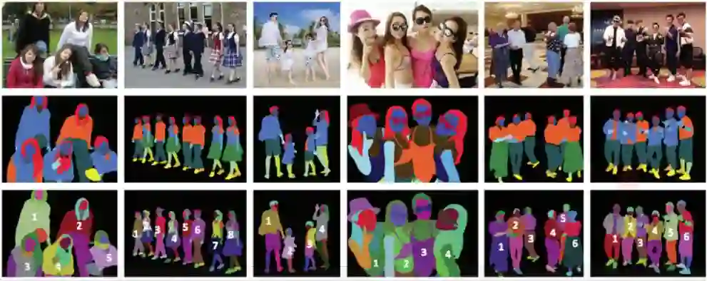 图 1:大规模「多实例级人体解析(Crowd Instance-level Human Parsing,CIHP)」数据集,该数据集包含 38280 个经过精心标注的多人图像,它们内容各异且具备很高的复杂度。图像原图显示在第一行。语义部分分割的标注与实例级人体解析分别在第二和第三行。