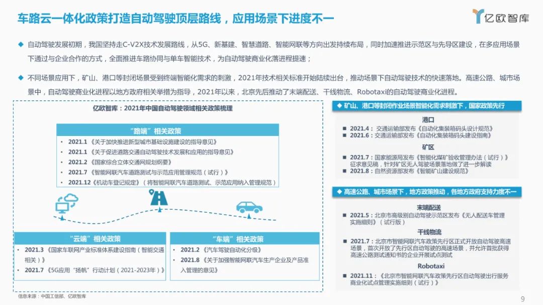 u 2021年中国出台自动驾驶相关政策,明确定义了自动驾驶等级分类,实现了道路交通安全、数据安全等法规监管的初步搭建。在国家与行业多方的共同支持下,中国自动驾驶与智能网联汽车产业的技术正取得不断突破,从测试验证转向了多场景示范应用。