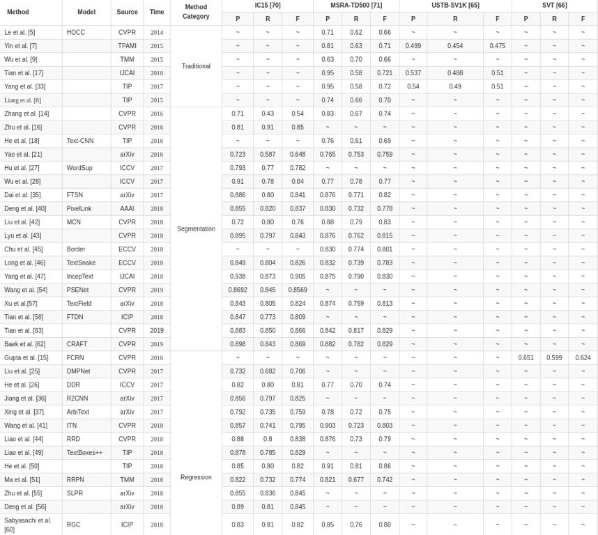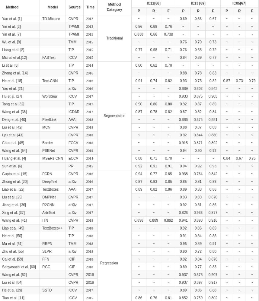 本小节整理了70篇场景文本检测重要论文的在不同类型数据集上的评估结果。部分截图如下表,详细内容请见资源链接。(注:P、R、F 分别代表Precision、Recall和F-measure。)