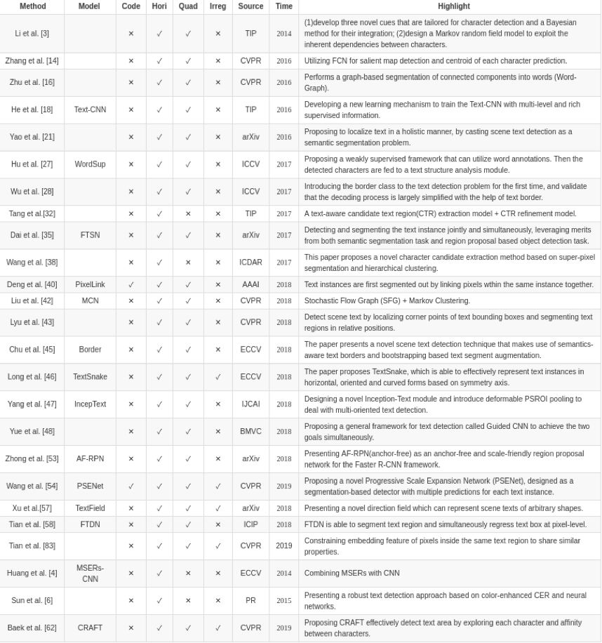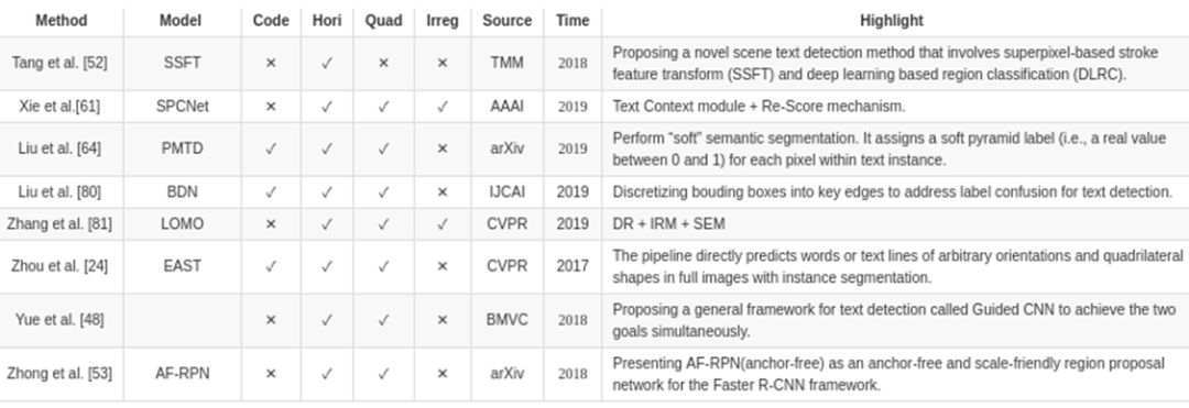 本小节整理并对比了场景文本检测中70篇重要论文(发表于TPAMI、TIP等期刊以及CVPR,ICCV等CCF A类会议),对比内容包括代码是否开源、方法分类、适用场景、出处、时间以及创新点等。