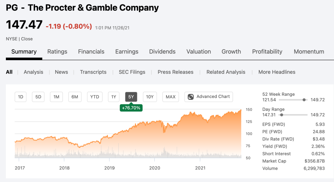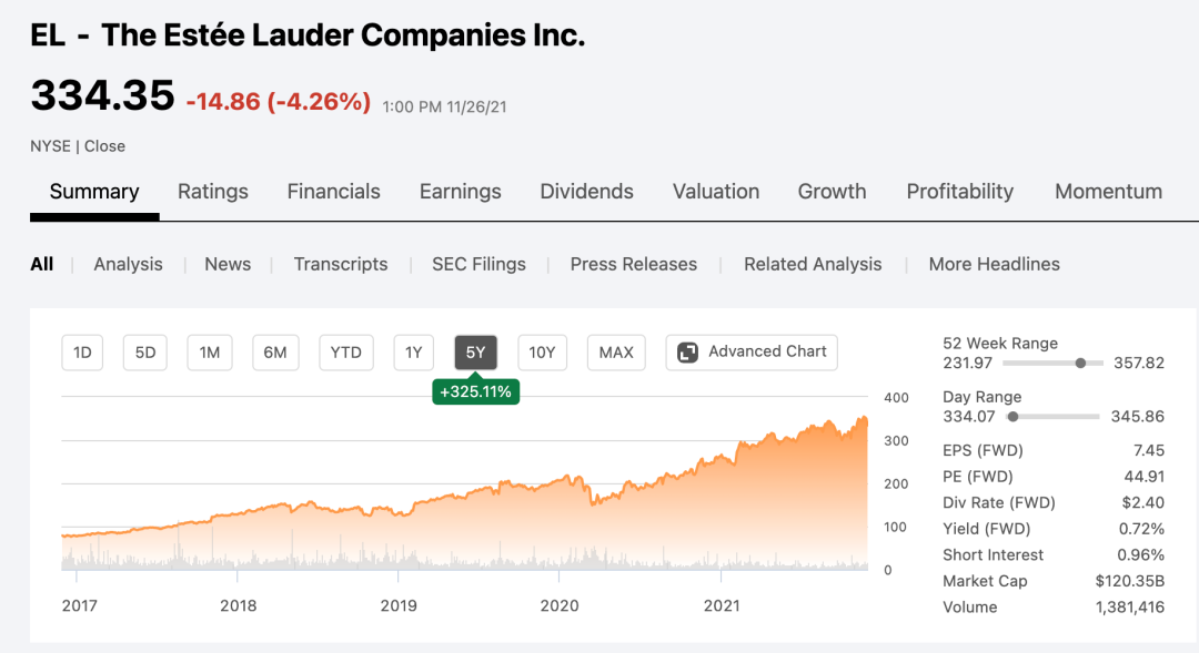 雅诗兰黛和宝洁近5年的股价走势 图源:Seeking Alpha
