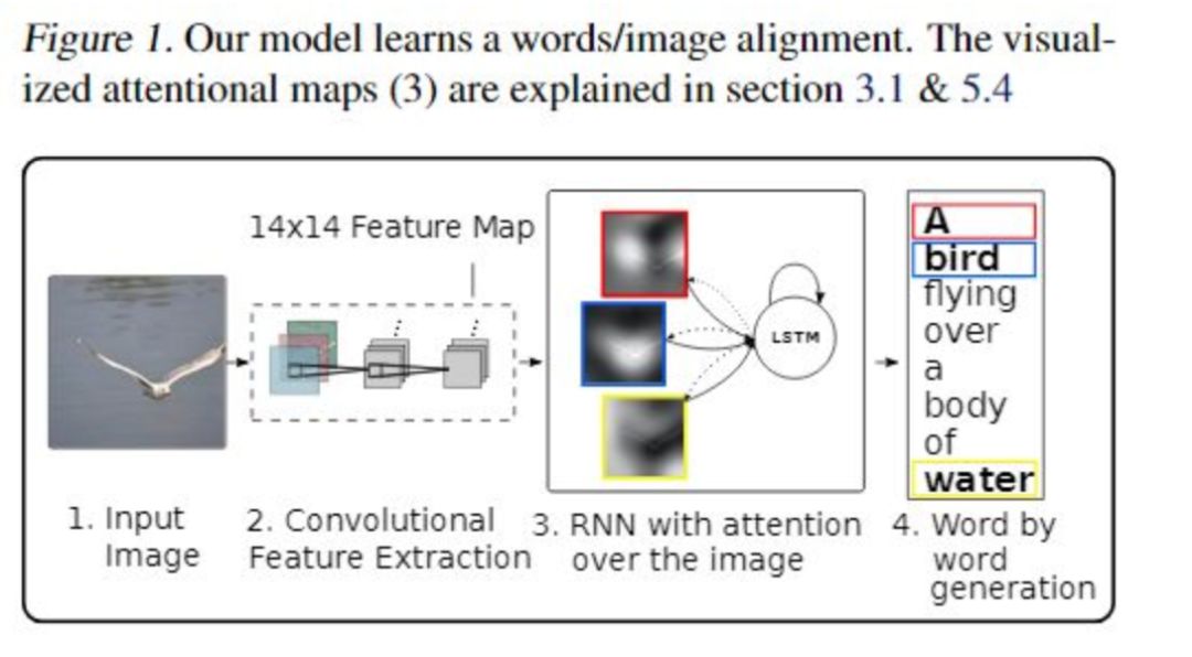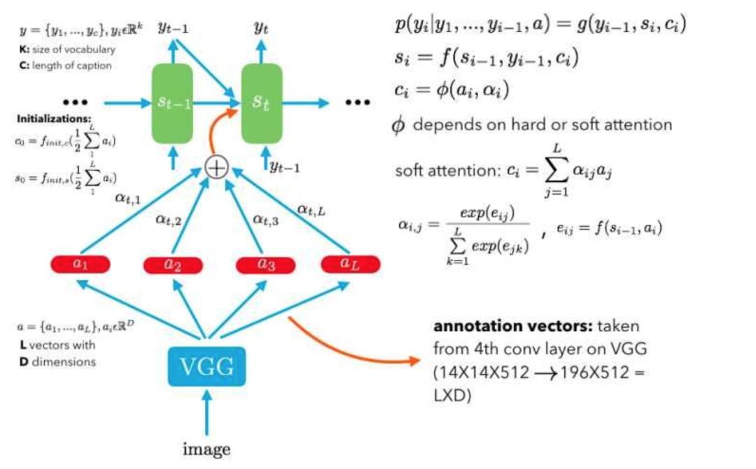这里编码器是VGG,解码器是LSTM。LTSM输入是不同时刻的图片的关注点信息,然后生成当前时刻的单词。