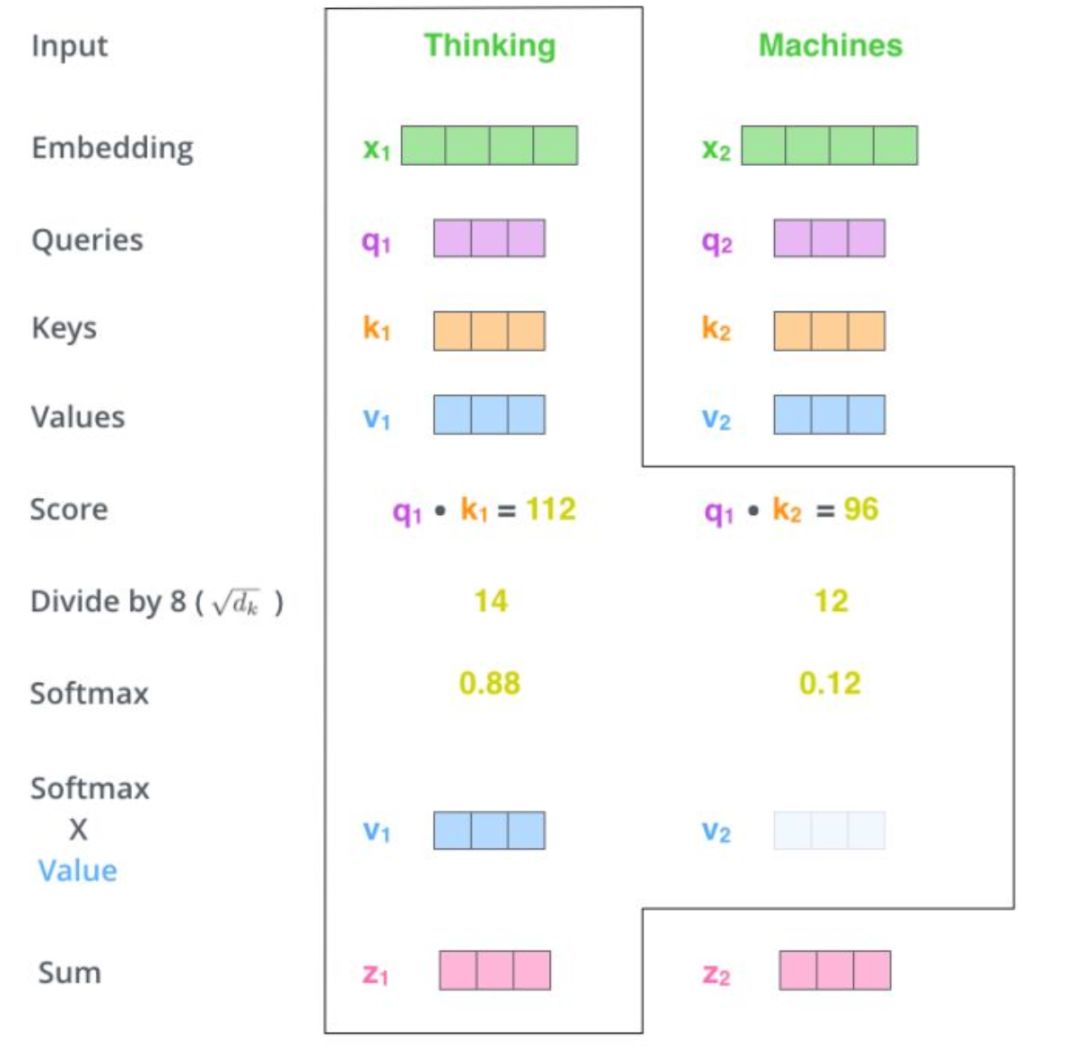 注意:分母是为了归一化,避免造成进入softmax函数的饱和区,其梯度较小。