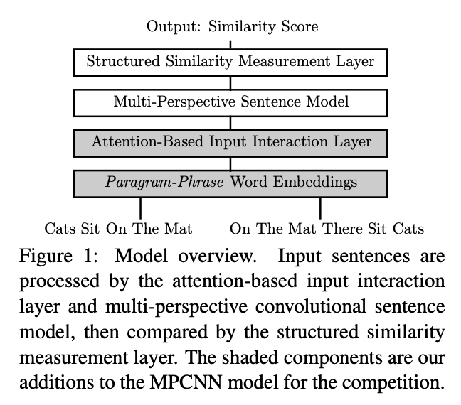 本文的基础模型结构是:MPCNN(multi-perspective con- volutional neural network model),主要包括两个部分:1,multi-perspective sentence model;2, structured similarity measurement layer。