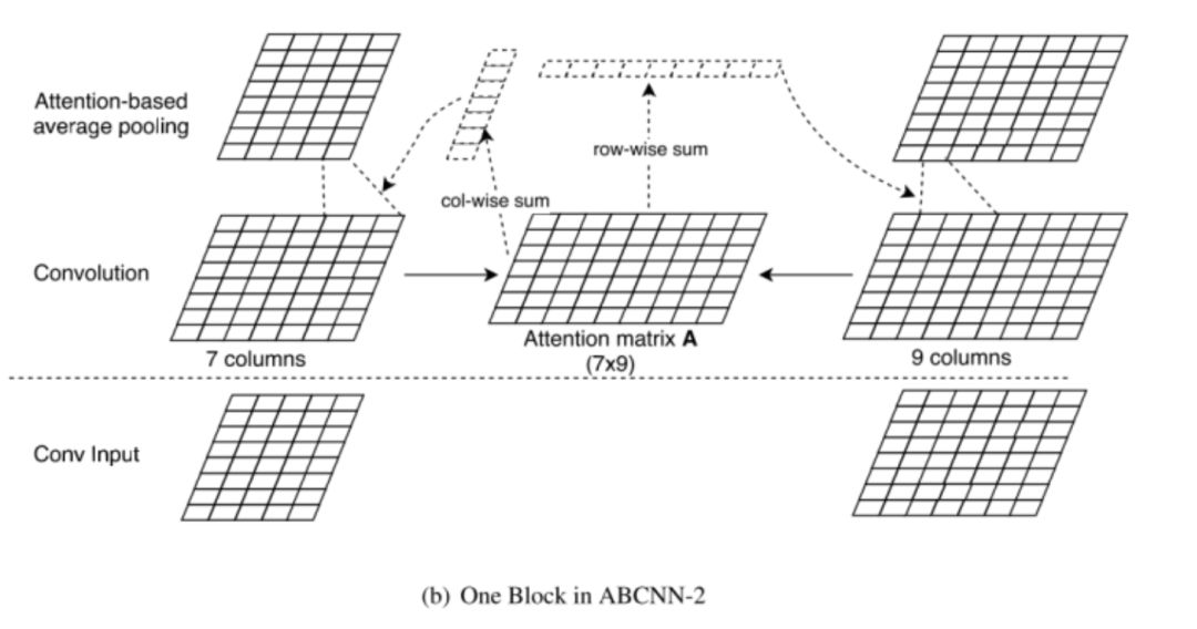 这里Attention矩阵的计算方式与ABCNN-1类似,不同的是在ABCNN-1的基础上对两个句子的unit进行求和作为unit的attention 值,即