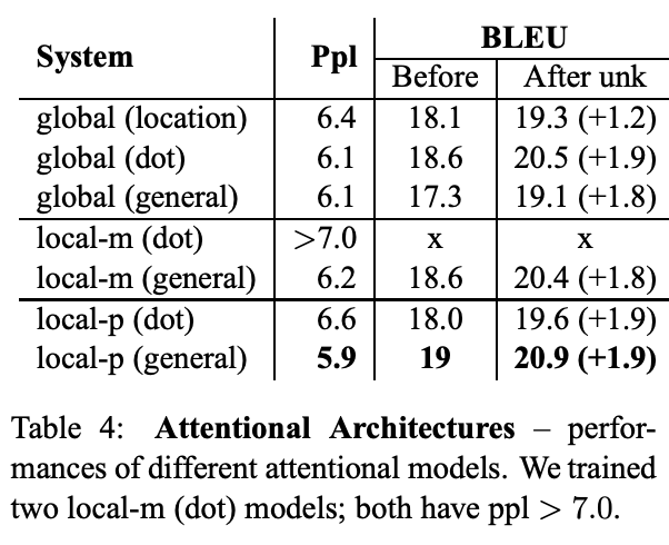 本文认为local attention为hard attention和soft attention的混合体(优势上的混合),因为他的计算复杂度要低于global attention,soft attention,而且与hard attention 不同的是,local attention 几乎处处可微,易于训练。