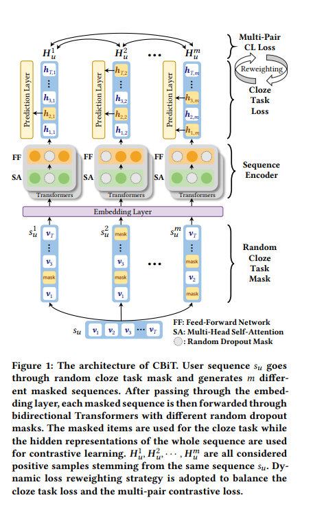 利用基于Transformer的序列编码器进行对比学习,在序列推荐方面取得了优势。它最大化了共享相似语义的成对序列扩充之间的一致性。然而,现有的序列推荐对比学习方法主要以左右单向Transformer为基础编码器,由于用户行为可能不是严格的从左到右的顺序,因此对于序列推荐来说,这种方法不是最优的。为了解决这个问题,我们提出了一种新的框架,名为对比学习与双向Transformer序列推荐(CBiT)。具体来说,我们首先在双向Transformer中对长用户序列应用滑动窗口技术,它允许对用户序列进行更细粒度的划分。然后我们结合完形填空任务掩码和dropout掩码生成高质量的正样本,进行多对对比学习,与普通的一对对比学习相比,表现出更好的性能和适应性。此外,我们还引入了一种新的动态损失加权策略来平衡完形任务损失和对比任务损失。在三个公共基准数据集上的实验结果表明,我们的模型在序列推荐方面优于最先进的模型。