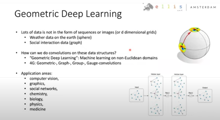 在这次演讲中,我将介绍下一代的图神经网络。GNN具有对图中节点的排列和图的整体旋转不变的特性。我们认为这是不必要的限制,在这次报告中,我们将以更灵活的等变结构探索这些GNN的扩展。特别地,一般图的自然图网络在节点排列下是全局等变的,但仍然可以通过局部消息传递协议执行。我们在流形上的mesh-CNNs在SO(2)规范变换下是等变的,因此,与常规的GNN不同,它具有非各向同性的核。最后,我们的SE(3)转换器是局部消息传递GNN,对排列不变性,但对全局SE(3)变换是等价的。这些发展清楚地强调了几何和对称作为图(或其他)神经网络设计原则的重要性。