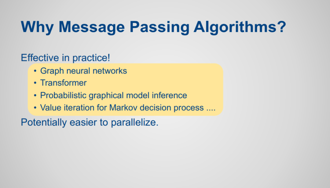 消息传递算法是在图上操作的分布式算法,其中每个节点只使用本地存在于节点和事件边缘的信息,并且只将信息发送给其邻近节点。它们通常在机器学习中非常有效,而且相对容易并行化。例子包括概率图形模型的近似推理算法,马尔科夫决策过程的值迭代算法,图神经网络和注意力网络。