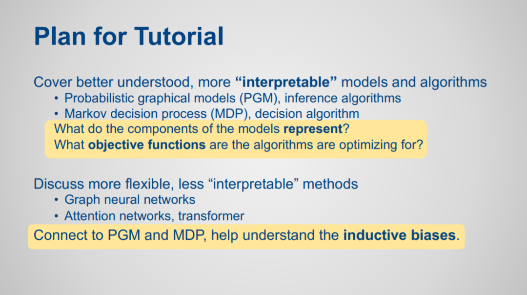 本教程介绍了概率图模型常用的近似推理算法和马尔科夫决策过程的值迭代算法,重点是了解算法优化的目标。然后我们考虑更灵活但更难以解释的信息传递算法,包括图神经网络和注意力网络。我们讨论了这些更灵活的网络如何模拟更易于解释的算法,通过算法对齐提供了对这些网络的归纳偏差的一些理解,并允许将这种理解用于网络设计。