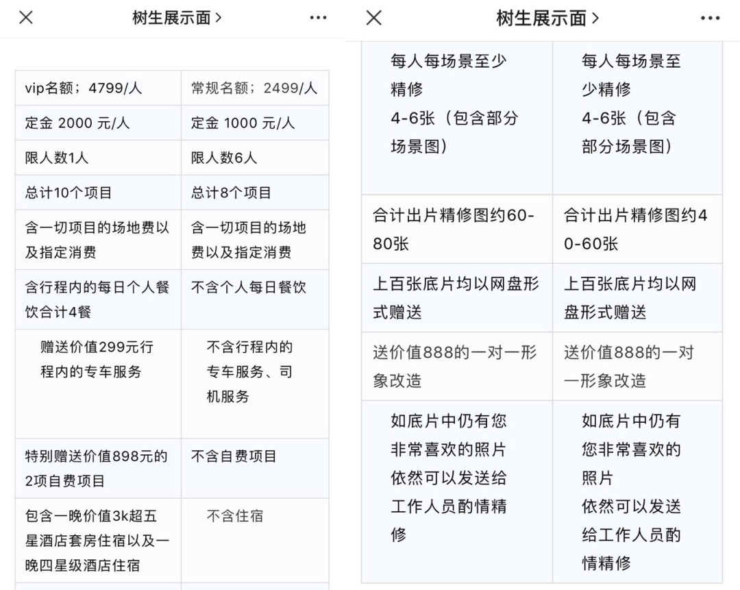 另外一家拍摄机构介绍称,1599元/人,含个人拍摄需要的服装、场地费,服务包含个人穿搭、形象指导,拍摄时形态肢体动作指导,每人每场景至少精修3-6张照片。