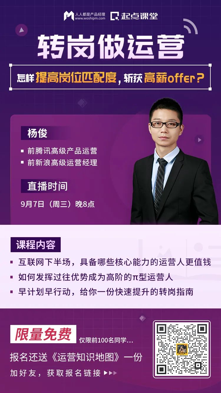 针对以上问题,我们也特意邀请有16年运营经验的@杨俊老师,在9月7日(周三)20:00做一场 针对转岗人的直播公开课!