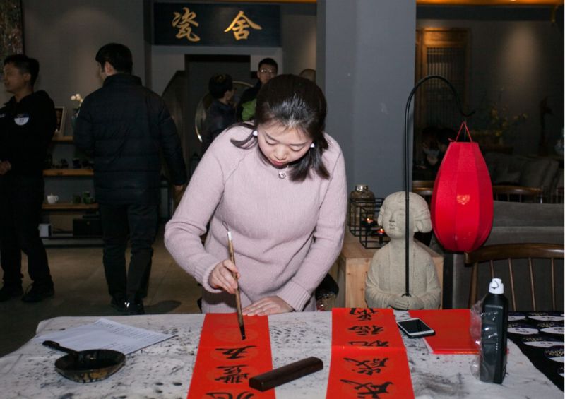 现场书写春联送祝福,妹子的字写得不错吧~