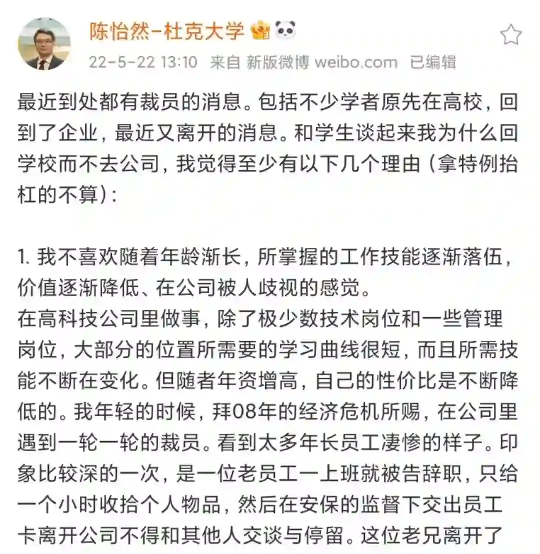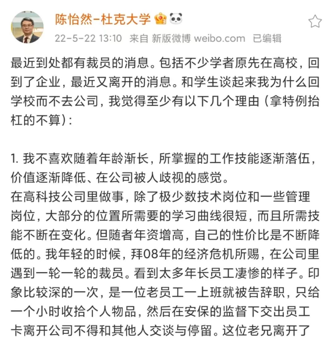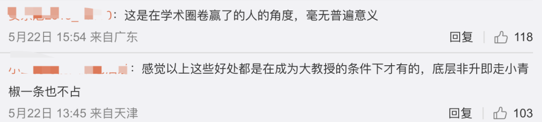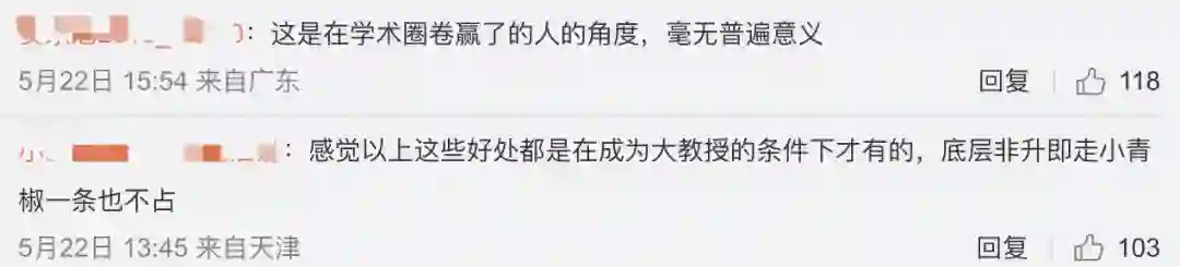所以,也有网友留言表示对陈教授以上观点有不同的见解,说这是在学术圈卷赢了的人的角度,感觉以上好处都是在成为大教授的条件下才有的,底层非升即走小青椒一条也不占。
