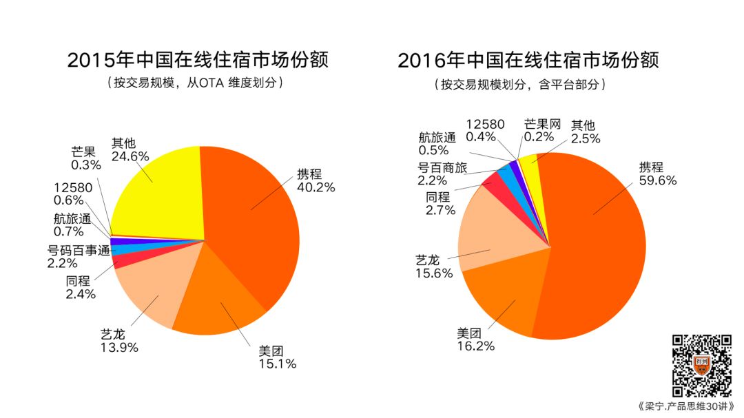以酒店一项,2015年携程一家是占40%,2016年进一步扩大了优势,携程一家占到60%的市场份额。美团大概占了16%,艺龙15.6%,其他人都消失不见了。