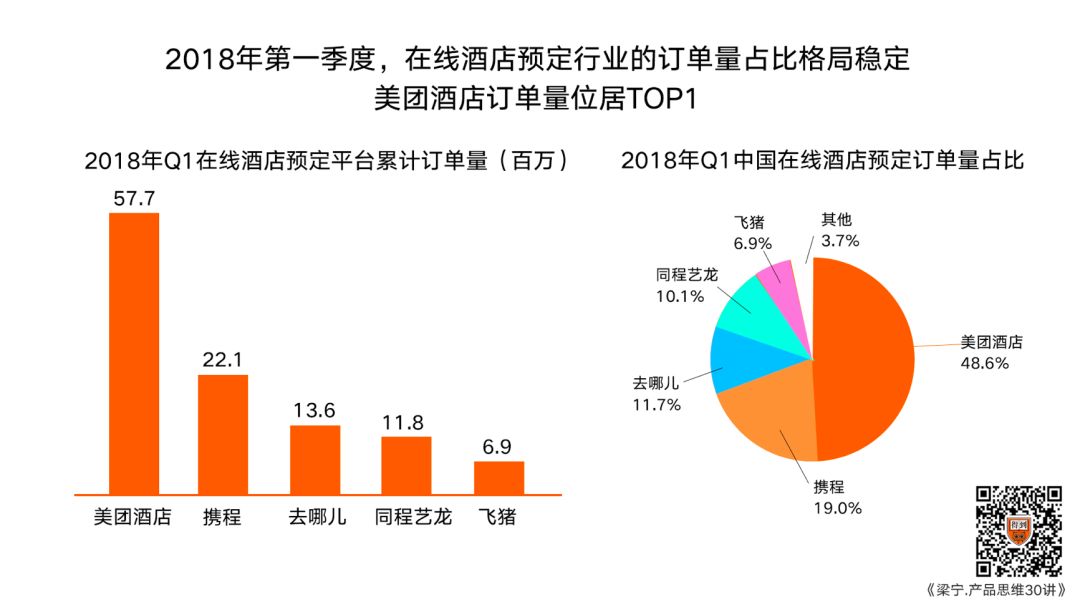 接着看这张图,是2018年的一季度,美团酒店的在线订单,超过了携程系的总和,将近占到了这个市场的49%。