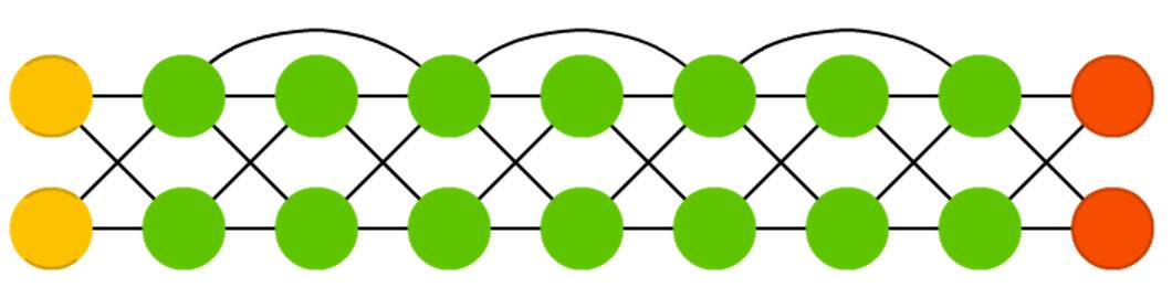 深度残差网络(DRN)是在逐层连接的基础上,带有额外层间连接(通常间隔二到五层)的极深 FFNN。DRN 不像常规网络那样,力求解得输入到输出经过多层网络传递后的映射关系;它往解中添加了一点儿恒等性,即把浅层的输入直接提供给了更深层的单元。实验证明,DRN 可以高效地学得深达150层的网络,其性能远远超过了常规的二到五层的简单网络。然而有人证明,DRN 其实是不具备明确时间结构的 RNN,所以经常被类比作没有门单元的 LSTM。