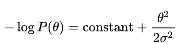 其中,第二行到第三行使用了贝叶斯定理,第三行到第四行P(X)可以丢掉因为与θ无关。注意-log P(X|θ)其实就是NLL,所以MLE和MAP在优化时的不同就是在于先验项-log P(θ)。好的,那现在我们来研究一下这个先验项,假定先验是一个高斯分布,即