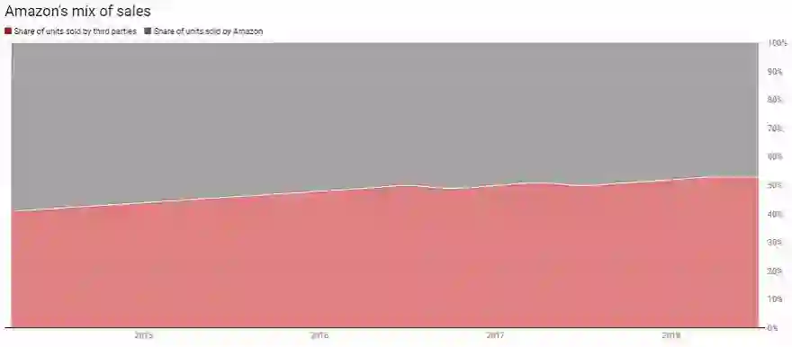 这一计划的重要性可以体现在数字上。如今,亚马逊市场占亚马逊销售的所有实体商品的53%,高于2014年的41%。