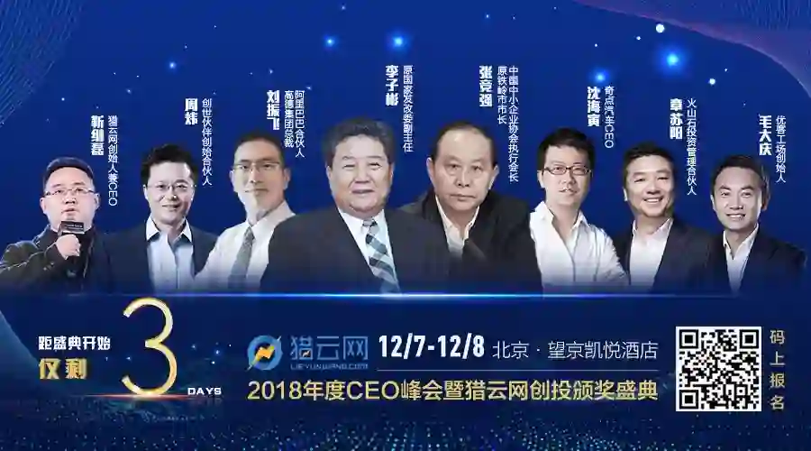 春秋变换,万象更新,新的流量和入口接踵而至,我们迎来了前所未有的创业变革时代,创业者如何在坚韧的商业世界里照射进创新之光?企业如何面对挑战勇立潮头?资本又如何瞄准趋势突围成功? 12月7日-8日,近百位知名资本大咖,独角兽创始人、创业风云人物,以及近千位投资人及创业者与您相约“聚势谋远 创变未来——2018年度CEO峰会暨猎云网创投颁奖盛典” 来自硬科技、智能、文娱、零售、医疗、教育、汽车等领域的创新者们将分享科技和产业的前沿观点,探讨创新潮流趋势,把脉未来新方向!