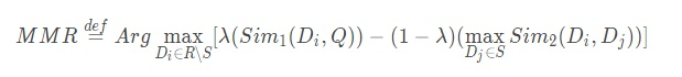我们首先看一个非单调submodular函数做摘要的例子。论文中给出了MMR的例子,关于MMR(Maximal Marginal Relevance)算法,同样在我之前的文章中有详细介绍,这里就不重复描述了,仅给出其公式: