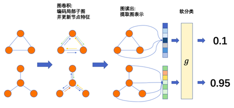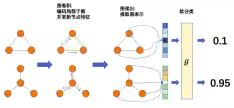 这里使用的图分类器和应用在图像或者语音上的分类器类似——先通过多层神经网络计算每个样本的表示(representation),再通过表示计算出每个类别的概率,最后通过向后传播计算梯度。一个常见的图分类器由以下几个步骤构成: