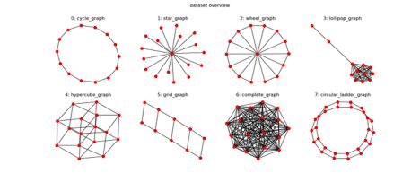 这里我们设计了一个简单的图分类任务。在 DGL 里我们实现了一个迷你图分类数据集(MiniGCDataset)。它由以下 8 类图结构数据组成。每一类图包含同样数量的随机样本。任务目标是训练图神经网络模型对这些样本进行分类。