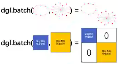 DGL 提供了名为 dgl.batch 的接口来实现打包一个图批量的功能。其核心思路非常简单。将 n 张小图打包在一起的操作可以看成是生成一张含 n 个不相连小图的大图。下图的可视化从直觉上解释了 dgl.batch 的功能。