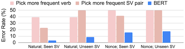 BERT 在自然和随机数评估语句上的错误率,按训练期间是否在同一句子中看到特定的主语谓语 (SV) 对进行分类。BERT 在未见过的主语谓语对上的表现远远优于简单的启发式算法,例如,选择更频繁的谓语动词或选择更频繁的主语谓语对
