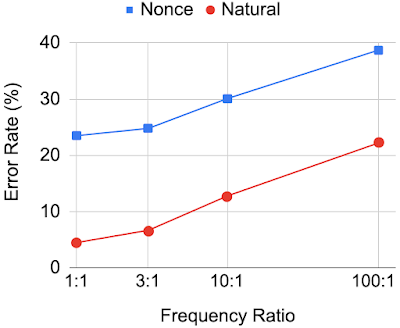 最后,我们想了解动词单复数形式的相对频率如何影响 BERT 的预测结果。例如,如果动词的一种形式(例如,“combat”)比另一种动词形式(例如,“combats”)更频繁地出现在预训练数据中,那么 BERT 更有可能分配高概率到出现频率更高的形式,即使它在语法上是不正确的。为了评估这一点,我们再次使用了相同的 60 个动词,但这次我们创建了预训练数据的人为操纵版本,其中两种动词形式之间的出现频率比从 1:1 变化到 100:1 不等。下图显示了 BERT 在这些不同程度的频率不平衡下的表现情况:
