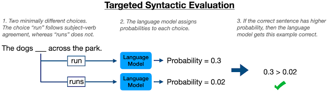 早期的这项研究同时使用自然语句(取自维基百科)和随机数语句来评估 BERT,后者指人为构造的符合语法但在语义上无意义的语句,例如 Noam Chomsky 的著名例句“colorless green ideas sleep furiously(无色的绿色想法愤怒地睡觉)”。随机数语句在测试句法能力时很有用,因为模型不能仅依赖于表面的语料库统计数据:例如,虽然“dogs run”比“dogs runs”更为常见,但“dogs publish”和“dogs publishes”都非常少见,因此模型不可能只是记住其中一个比另一个更有可能这样的事实。