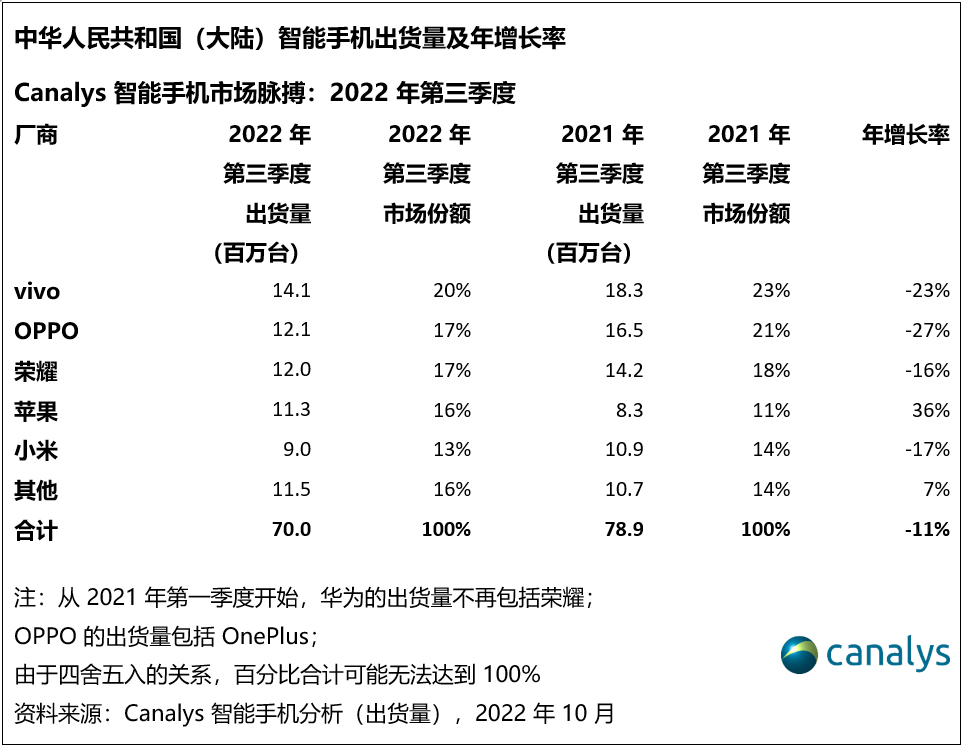 科技市场分析机构 Canalys 公布了 2022 年第三季度中国大陆智能手机市场报告,出货量为 7000 万台,同比下跌 11%。vivo、OPPO、荣耀、苹果、小米排名前五,第三季度苹果在中国大陆实现了显著的增长,iPhone 14 Pro 系列的强劲需求贡献了苹果的出货表现。Canalys 预计中国大陆智能手机市场将在 2023 年持平于 2022 年或出现小幅回升。